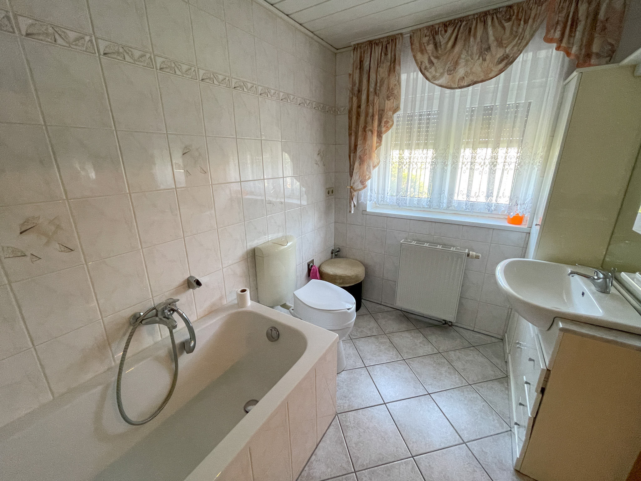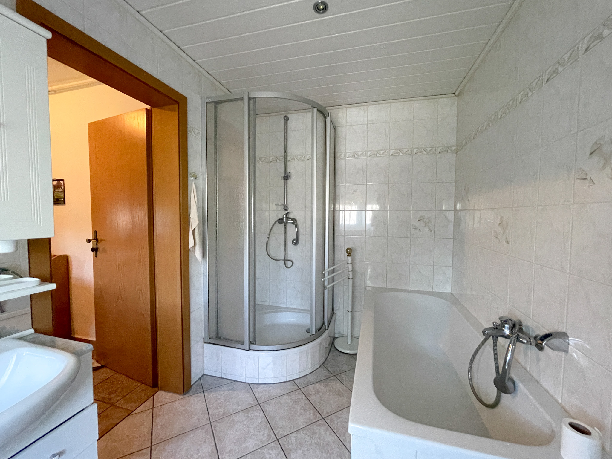 Das Haus selbst ist teilweise unterkellert und verfügt über ein bislang nicht ausgebautes Dachgeschoss, das als zusätzliche Wohn- oder Stauraumreserve dient. Im Inneren erwartet Sie ein freundliches Badezimmer mit Dusche, Badewanne und Tageslichtfenster, ergänzt durch ein separates WC. Die Wohnräume sind mit PVC-, Fliesen- und Teppichböden ausgestattet. Für wohlige Wärme sorgen neben einer Zentralheizung auch zwei Kachelöfen, die in den kalten Monaten eine besonders gemütliche Atmosphäre schaffen. Die Heizung wurde 2013 erneuert.